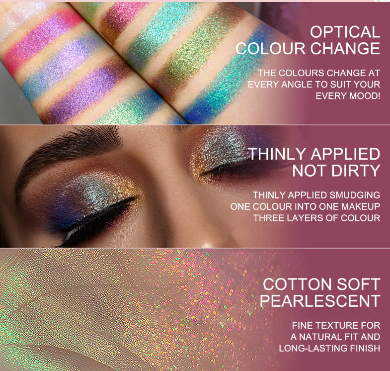 Color changing effect: The unique dual color changing formula can present different color effects under different light and angles, creating a rich and colorful eye makeup effect.
